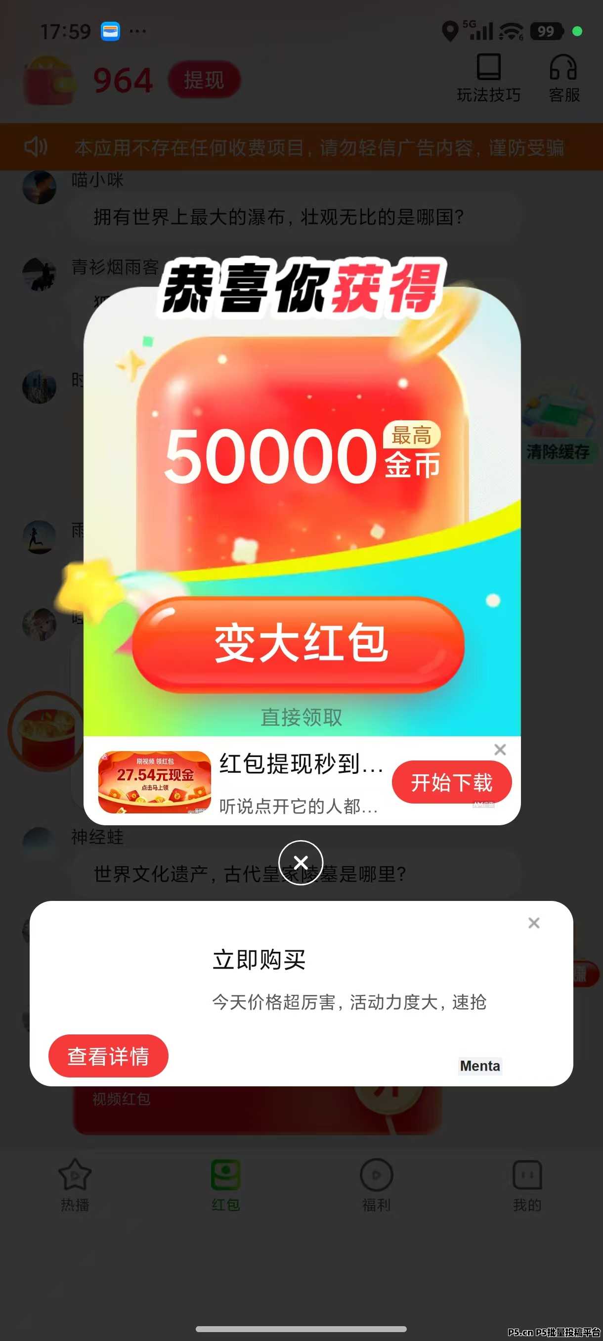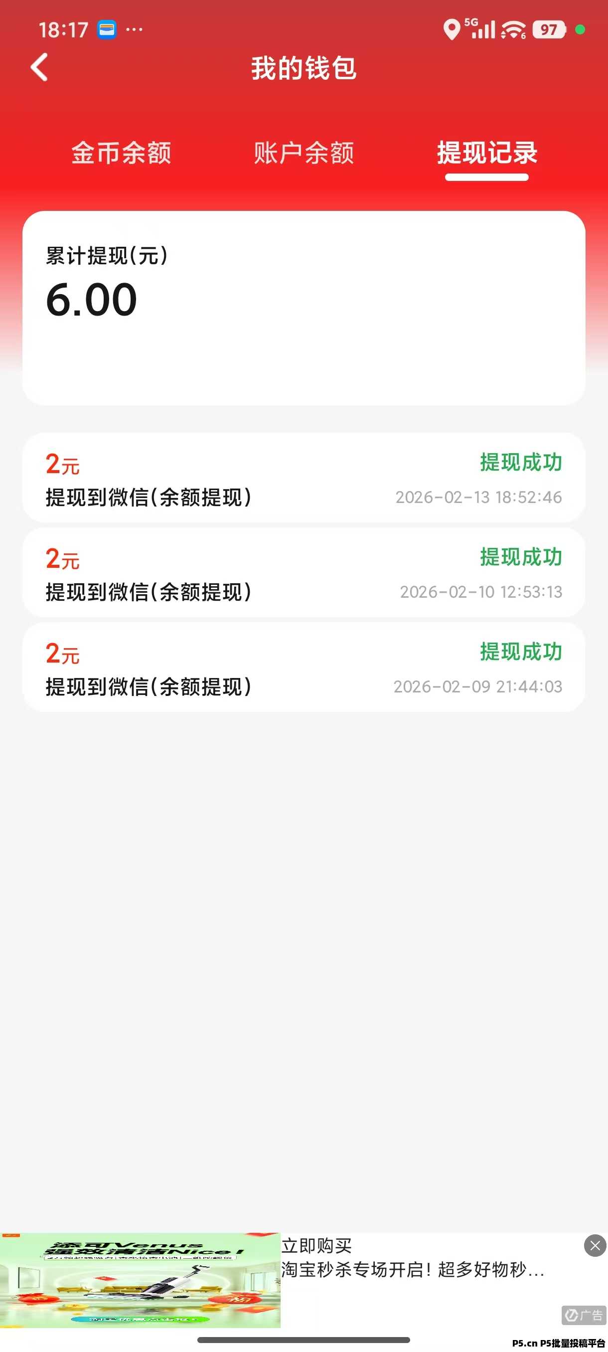 打开APP点下面菜单红包,点左边红包图形,如果5万金币旁有最高金币就点变大红包,如果没有最高金币就点直接领取。然后会跳出广告,就看广告,广告上面有时间显示。左上角提现跳转金币余额点兑换,再点帐户余额点提现。每天只看一会,就是一块。多个APP看广告,金币比较稳。加我QQ 3585745212加QQ群959569434里面有多种看广告技巧