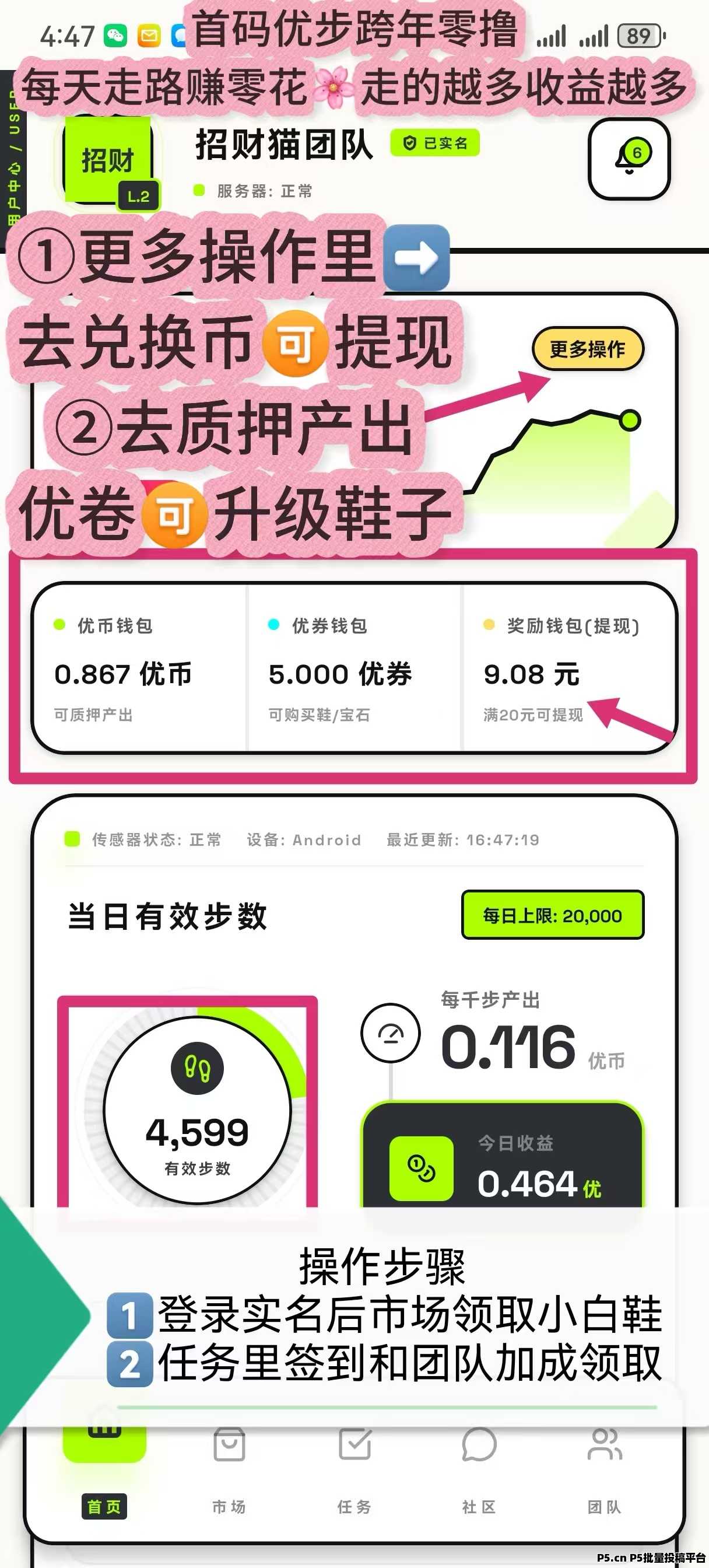1-市场里面免费领取小白鞋2-任务里~签到和团队加成领取